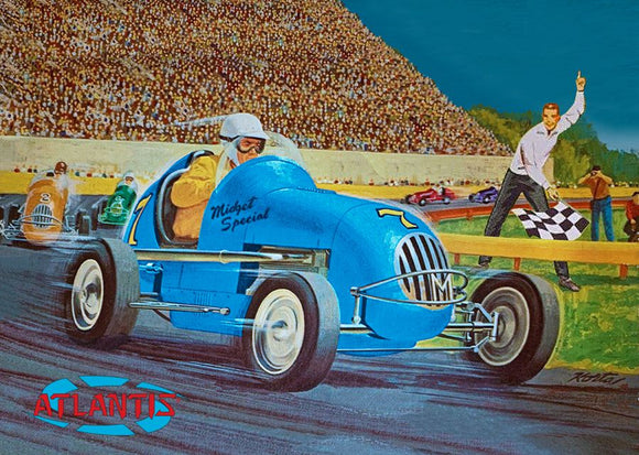 AANM1101/20 scale. The kit comes from the Original tooling. This was the first all plastic Kit created by Monogram in the early 1950's. It builds into a fantastic model. All 32 parts are molded in baby blue. Comes with a piece of clear acetate for the windscreen driver figure and detailed Offenhauser engine. Atlantis Models did completely update the decal sheet with more numbers and sponsors of the era. Skill level 2.